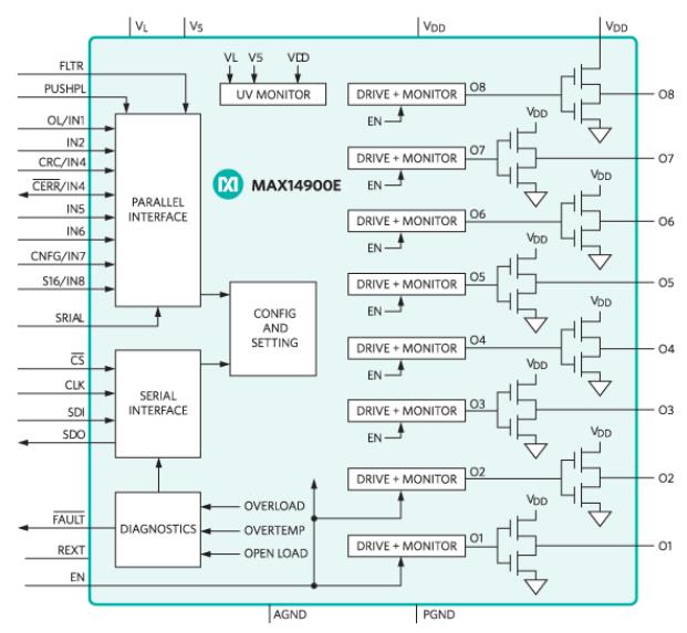 The MAX14900E is configured, monitored, and driven by an SPI and/or parallel interface. In parallel mode, eight logic inputs directly control the outputs and the serial interface can be used for configuration/monitoring. Serial mode utilizes the serial interface for both setting and configuration, and features CRC error detection to ensure robust SPI communication.